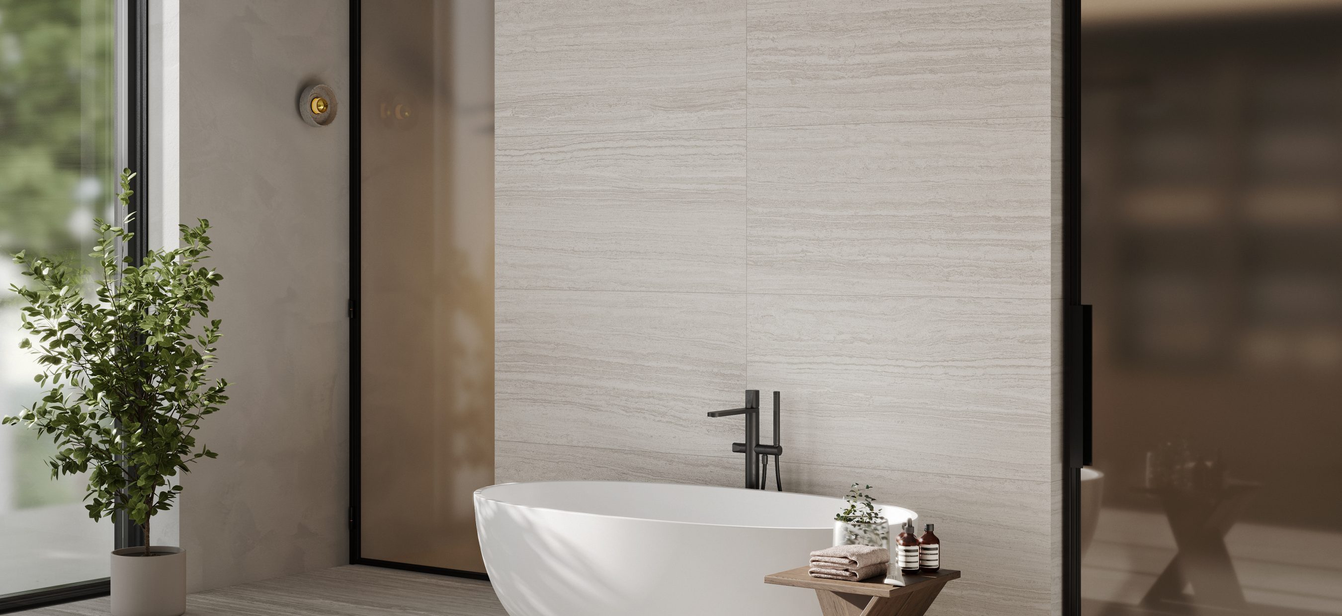 Its soft, linear veining faithfully reproduces the timeless elegance of travertine, bringing visual harmony and a sense of continuity to any architectural project.